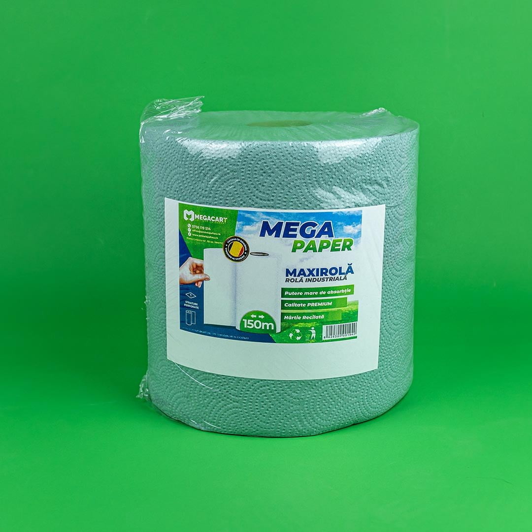'-Rola de hartie industriala este realizata din hartie reciclata, cu o putere mare de absorbtie.-Produs in Romania si recomandat pentru o gama larga de utilizare.-Foile de hartie se desprind usor, fara a se rupe sau destrama.-La folosire nu lasa scame, putand fi folosite in diferite activitati.-Rolele de hartie avand o dimensiune adecvata, sunt usor de depozitat si de transportat.Dimensiune: Diametru 24cm x Inaltime 26cmLungime rola: 150m